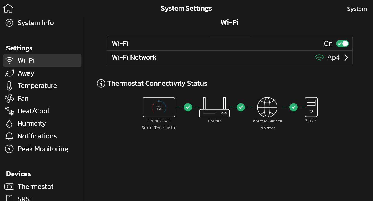 NOTE: Verify that the thermostat is connected to the home Wi-Fi and that all indicators are green, and check marked.